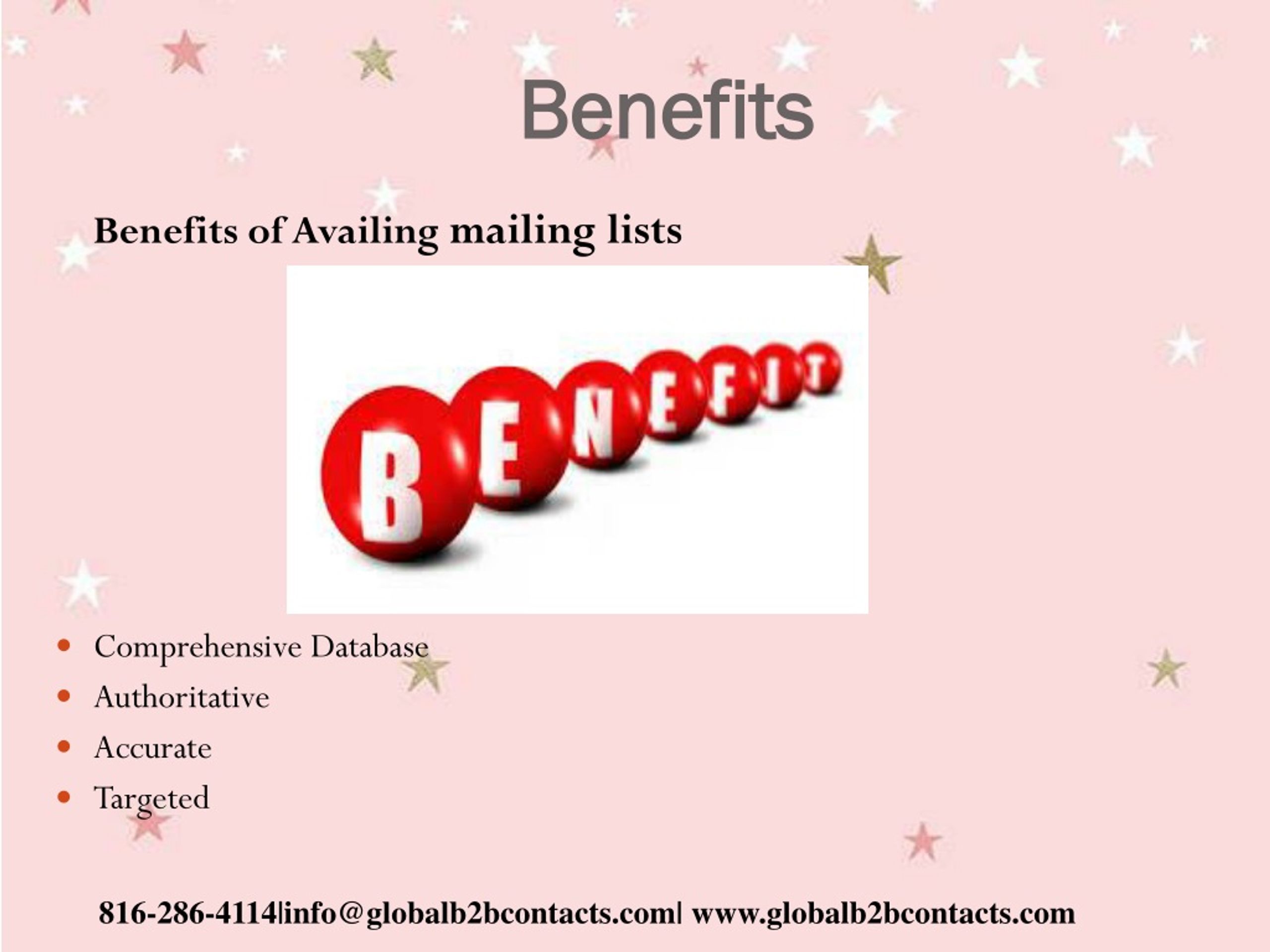 Benefits Benefits of Availing mailing lists • Comprehensive Database • Authoritative • Accurate • Targeted 816-286-4114|info@globalb2bcontacts.com| www.globalb2bcontacts.com