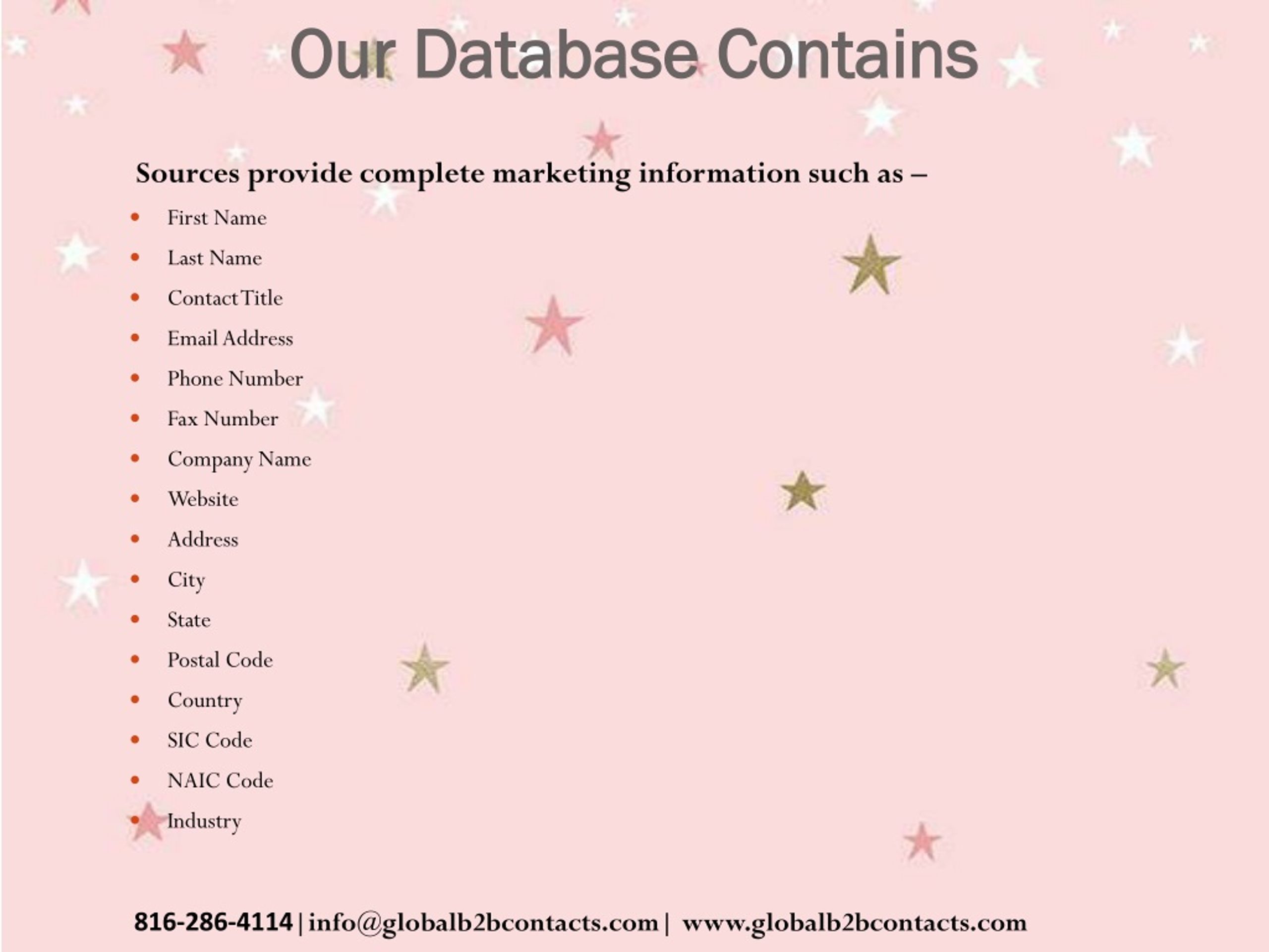 Our Database Contains Sources provide complete marketing information such as – • First Name • Last Name • Contact Title • Email Address • Phone Number • Fax Number • Company Name • Website • Address • City • State • Postal Code • Country • SIC Code • NAIC Code • Industry 816-286-4114|info@globalb2bcontacts.com| www.globalb2bcontacts.com