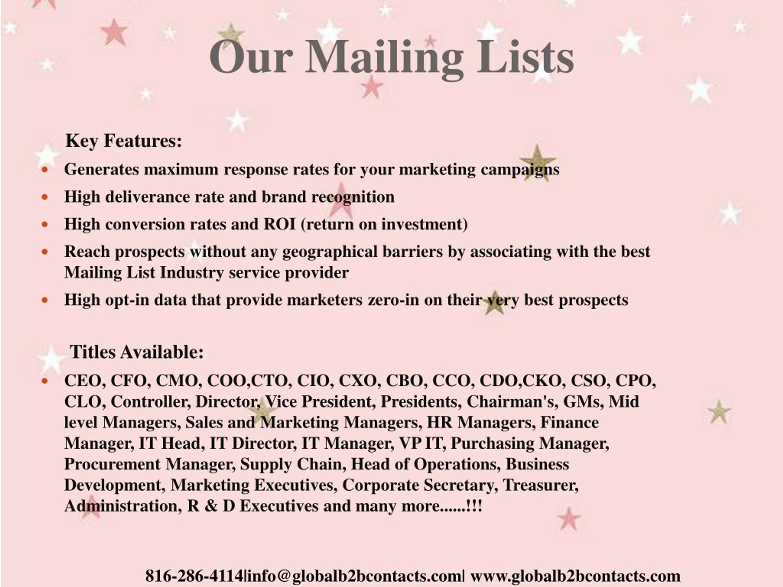 Our Mailing Lists Key Features: • Generates maximum response rates for your marketing campaigns • High deliverance rate and brand recognition • High conversion rates and ROI (return on investment) • Reach prospects without any geographical barriers by associating with the best Mailing List Industry service provider • High opt-in data that provide marketers zero-in on their very best prospects Titles Available: • CEO, CFO, CMO, COO,CTO, CIO, CXO, CBO, CCO, CDO,CKO, CSO, CPO, CLO, Controller, Director, Vice President, Presidents, Chairman's, GMs, Mid level Managers, Sales and Marketing Managers, HR Managers, Finance Manager, IT Head, IT Director, IT Manager, VP IT, Purchasing Manager, Procurement Manager, Supply Chain, Head of Operations, Business Development, Marketing Executives, Corporate Secretary, Treasurer, Administration, R & D Executives and many more......!!! 816-286-4114|info@globalb2bcontacts.com| www.globalb2bcontacts.com