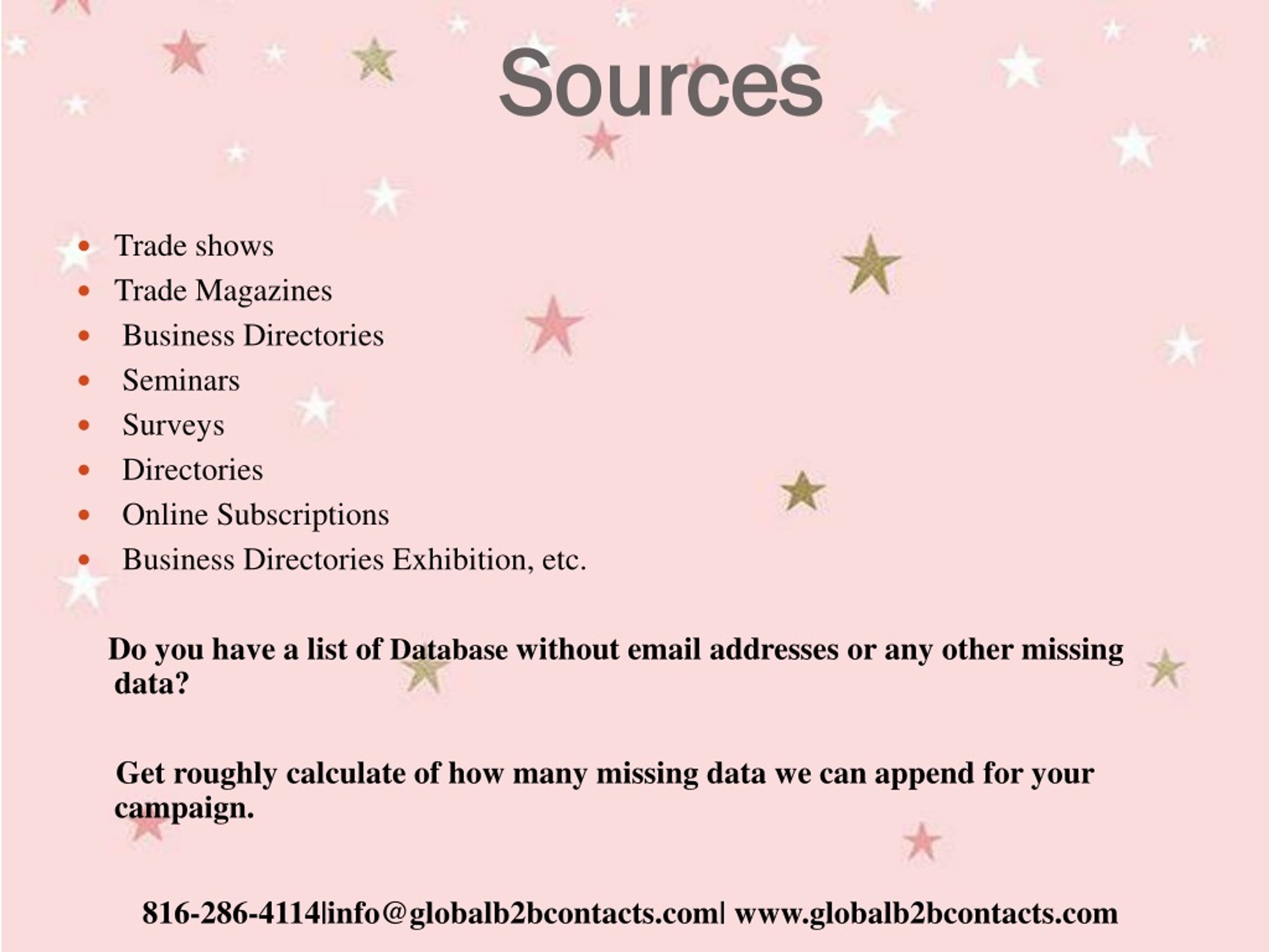 Sources • Trade shows • Trade Magazines • Business Directories • Seminars • Surveys • Directories • Online Subscriptions • Business Directories Exhibition, etc. Do you have a list of Database without email addresses or any other missing data? Get roughly calculate of how many missing data we can append for your campaign. 816-286-4114|info@globalb2bcontacts.com| www.globalb2bcontacts.com