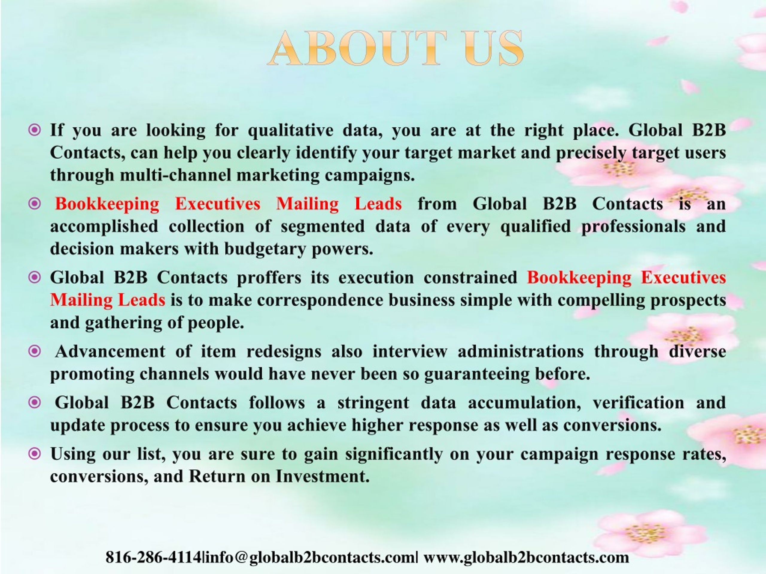 Global B2B Contacts LLC Bookkeeping Executives Mailing Leads Free Email Campaign along With B2B Email List Purchase 816-286-4114|info@globalb2bcontacts.com| www.globalb2bcontacts.com