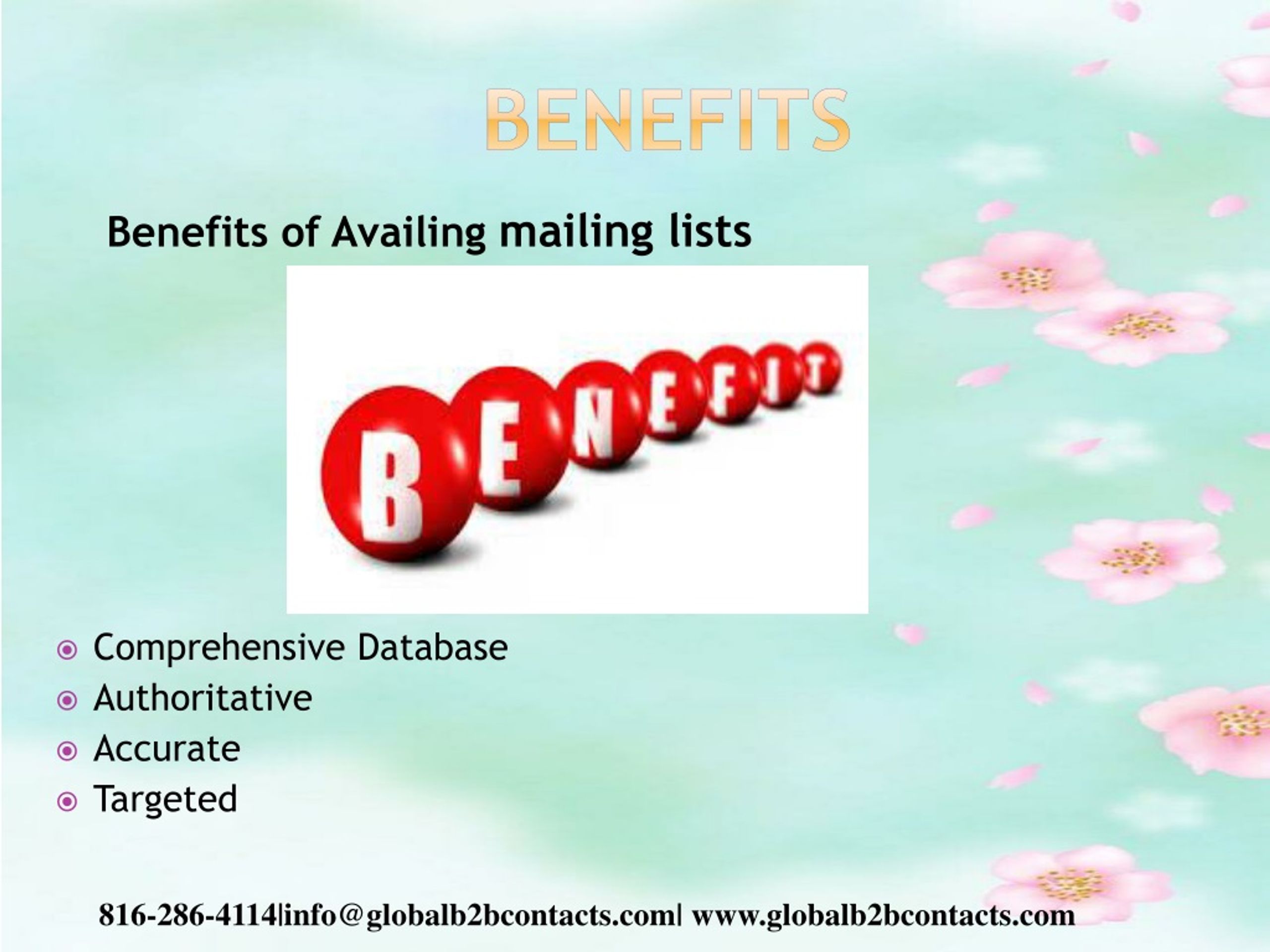Benefits Benefits of Availing mailing lists • Comprehensive Database • Authoritative • Accurate • Targeted 816-286-4114|info@globalb2bcontacts.com| www.globalb2bcontacts.com