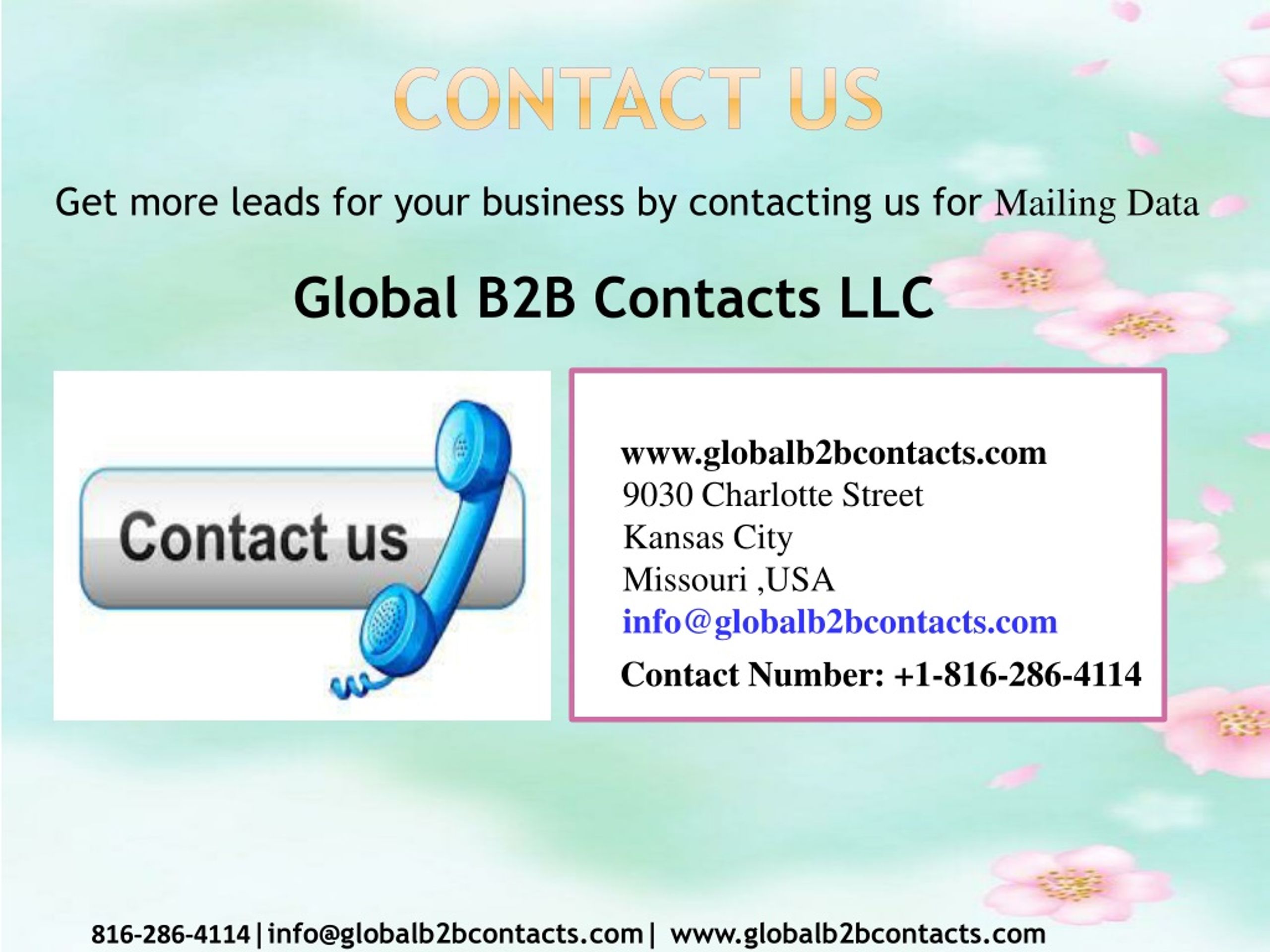 Contact Us Get more leads for your business by contacting us for Mailing Data Global B2B Contacts LLC www.globalb2bcontacts.com9030 Charlotte StreetKansas CityMissouri ,USAinfo@globalb2bcontacts.com Contact Number: +1-816-286-4114 816-286-4114|info@globalb2bcontacts.com| www.globalb2bcontacts.com