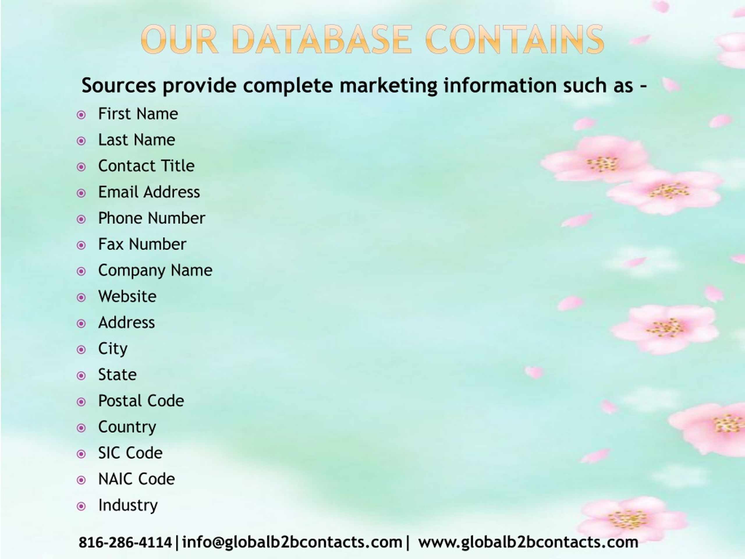 Our Database Contains Sources provide complete marketing information such as – • First Name • Last Name • Contact Title • Email Address • Phone Number • Fax Number • Company Name • Website • Address • City • State • Postal Code • Country • SIC Code • NAIC Code • Industry 816-286-4114|info@globalb2bcontacts.com| www.globalb2bcontacts.com