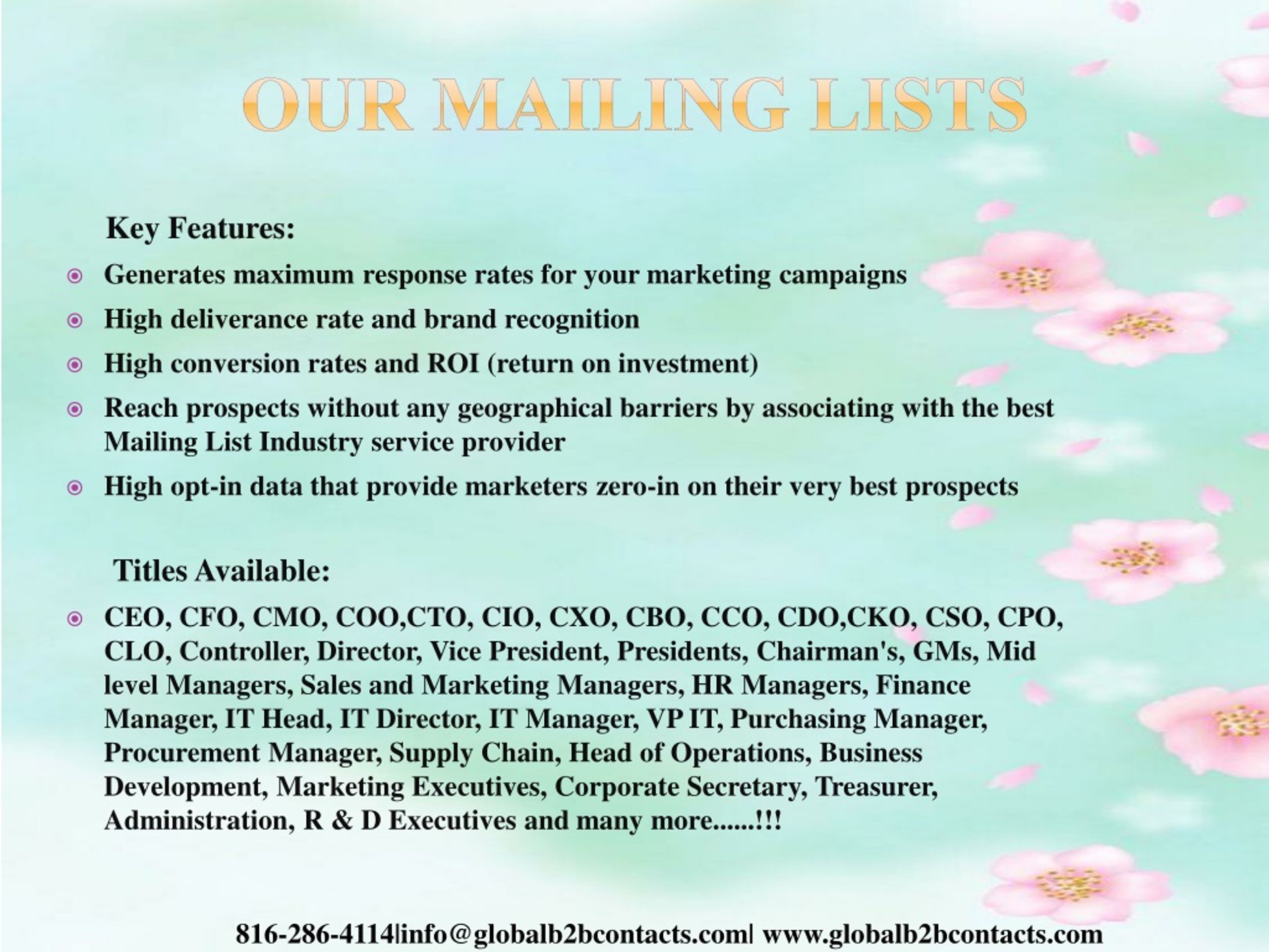 Our Mailing Lists Key Features: • Generates maximum response rates for your marketing campaigns • High deliverance rate and brand recognition • High conversion rates and ROI (return on investment) • Reach prospects without any geographical barriers by associating with the best Mailing List Industry service provider • High opt-in data that provide marketers zero-in on their very best prospects Titles Available: • CEO, CFO, CMO, COO,CTO, CIO, CXO, CBO, CCO, CDO,CKO, CSO, CPO, CLO, Controller, Director, Vice President, Presidents, Chairman's, GMs, Mid level Managers, Sales and Marketing Managers, HR Managers, Finance Manager, IT Head, IT Director, IT Manager, VP IT, Purchasing Manager, Procurement Manager, Supply Chain, Head of Operations, Business Development, Marketing Executives, Corporate Secretary, Treasurer, Administration, R & D Executives and many more......!!! 816-286-4114|info@globalb2bcontacts.com| www.globalb2bcontacts.com
