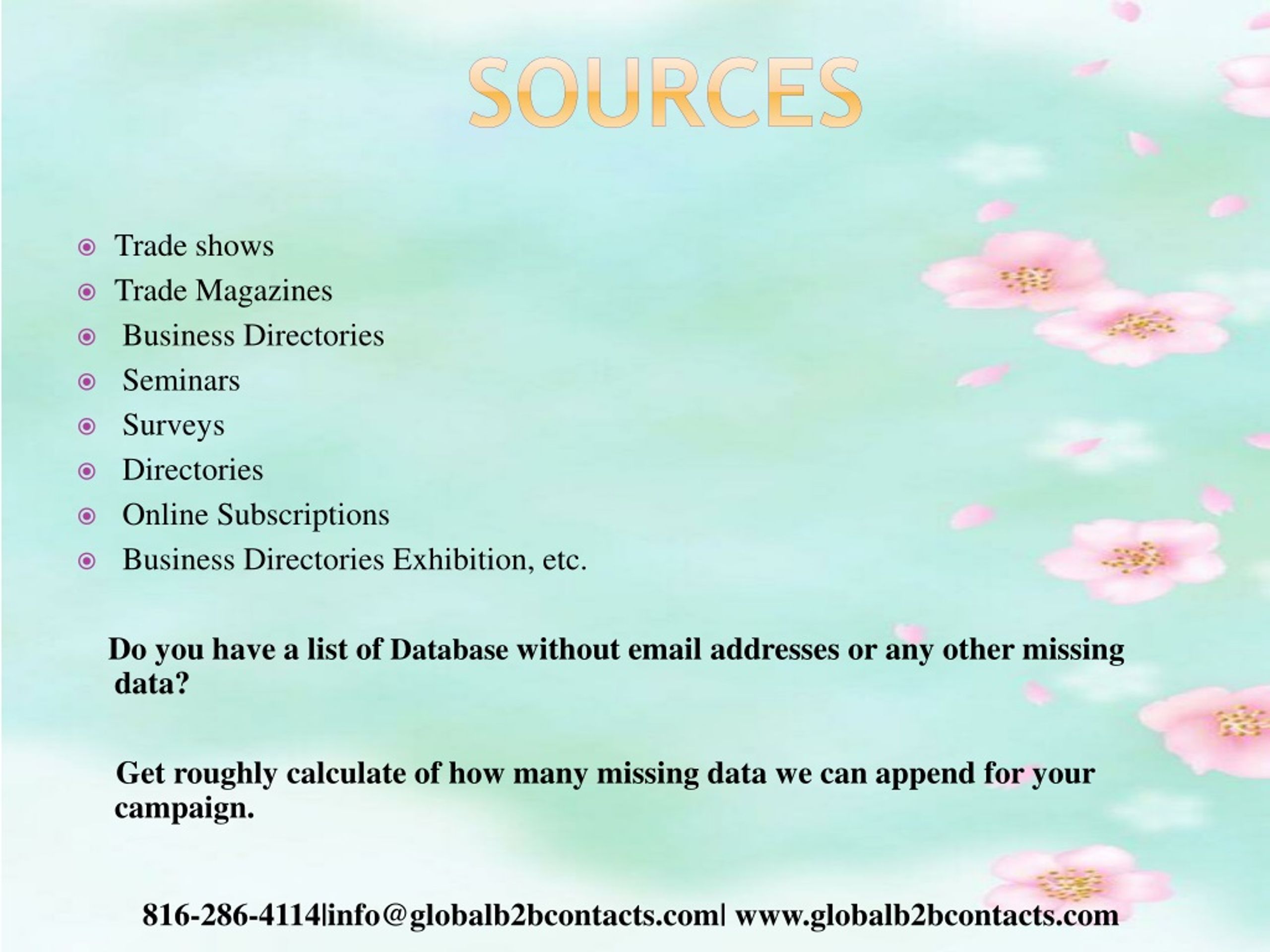 Sources • Trade shows • Trade Magazines • Business Directories • Seminars • Surveys • Directories • Online Subscriptions • Business Directories Exhibition, etc. Do you have a list of Database without email addresses or any other missing data? Get roughly calculate of how many missing data we can append for your campaign. 816-286-4114|info@globalb2bcontacts.com| www.globalb2bcontacts.com