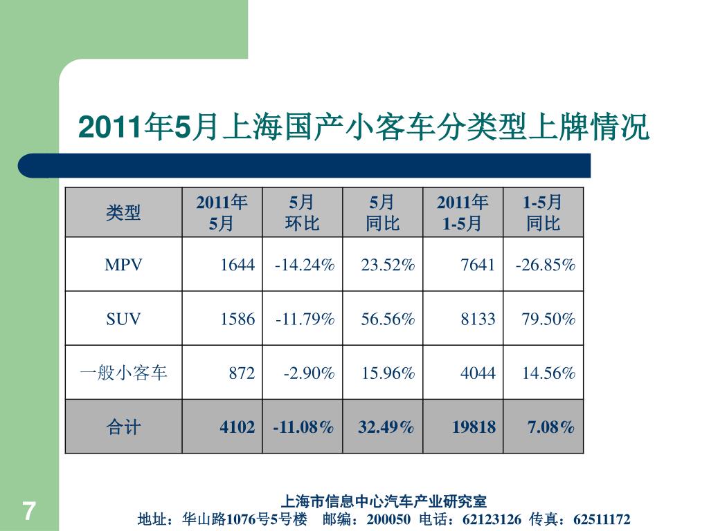 2011年5月上海国产小客车分类型上牌情况 上海市信息中心汽车产业研究室地址:华山路1076号5号楼 邮编:200050 电话:62123126 传真:62511172