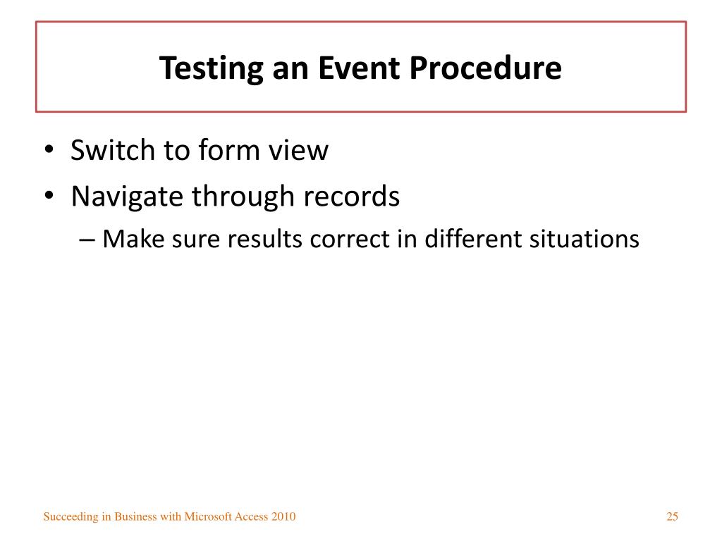 Testing an Event Procedure • Switch to form view • Navigate through records • Make sure results correct in different situations Succeeding in Business with Microsoft Access 2010