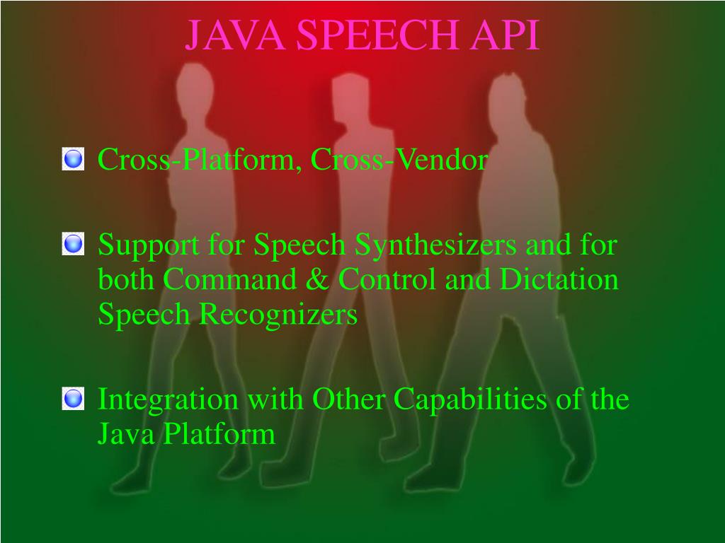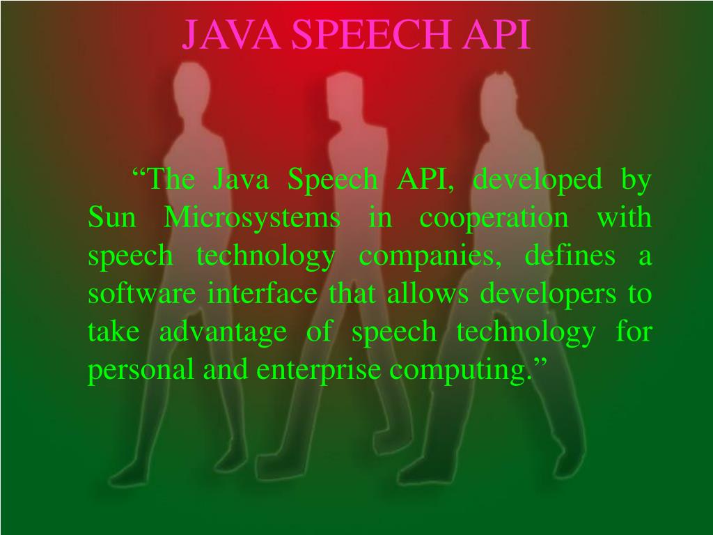 JAVA SPEECH API “The Java Speech API, developed by Sun Microsystems in cooperation with speech technology companies, defines a software interface that allows developers to take advantage of speech technology for personal and enterprise computing.”