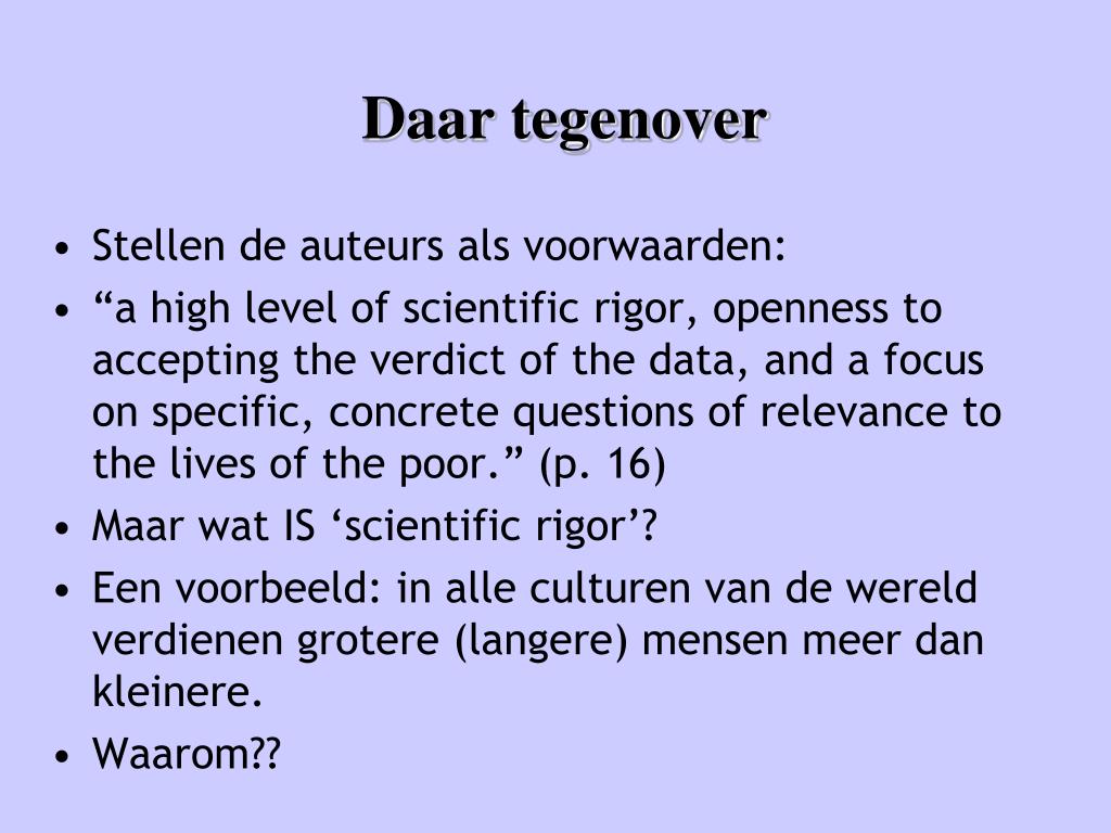 Daar tegenover • Stellen de auteurs als voorwaarden: • “a high level of scientific rigor, openness to accepting the verdict of the data, and a focus on specific, concrete questions of relevance to the lives of the poor.” (p. 16) • Maar wat IS ‘scientific rigor’? • Een voorbeeld: in alle culturen van de wereld verdienen grotere (langere) mensen meer dan kleinere. • Waarom??