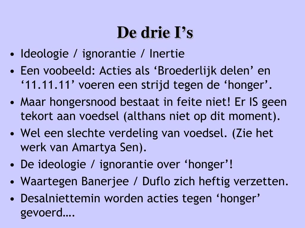 De drie I’s • Ideologie / ignorantie / Inertie • Een voobeeld: Acties als ‘Broederlijk delen’ en ‘11.11.11’ voeren een strijd tegen de ‘honger’. • Maar hongersnood bestaat in feite niet! Er IS geen tekort aan voedsel (althans niet op dit moment). • Wel een slechte verdeling van voedsel. (Zie het werk van Amartya Sen). • De ideologie / ignorantie over ‘honger’! • Waartegen Banerjee / Duflo zich heftig verzetten. • Desalniettemin worden acties tegen ‘honger’ gevoerd….