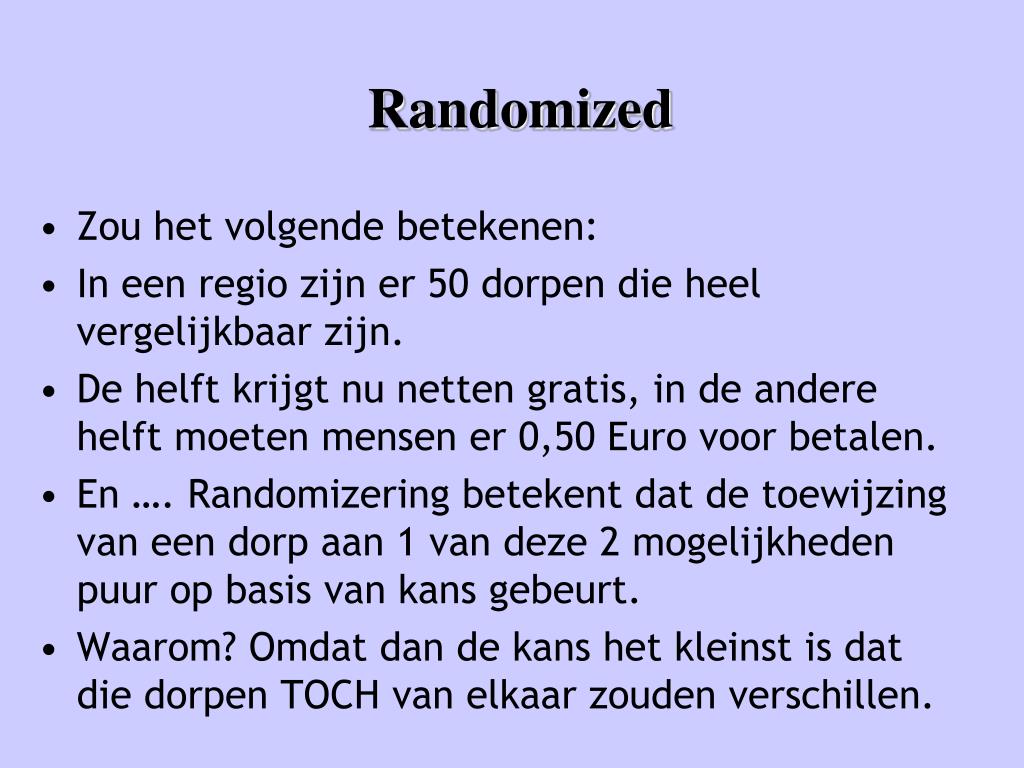 Randomized • Zou het volgende betekenen: • In een regio zijn er 50 dorpen die heel vergelijkbaar zijn. • De helft krijgt nu netten gratis, in de andere helft moeten mensen er 0,50 Euro voor betalen. • En …. Randomizering betekent dat de toewijzing van een dorp aan 1 van deze 2 mogelijkheden puur op basis van kans gebeurt. • Waarom? Omdat dan de kans het kleinst is dat die dorpen TOCH van elkaar zouden verschillen.