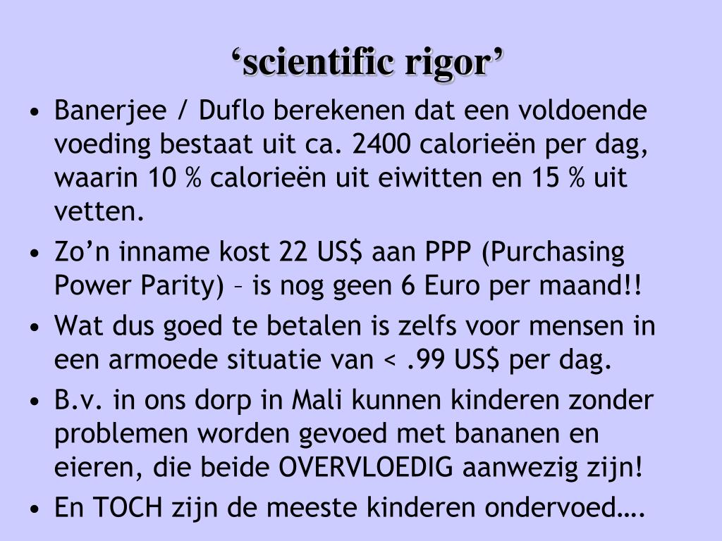 ‘scientific rigor’ • Banerjee / Duflo berekenen dat een voldoende voeding bestaat uit ca. 2400 calorieën per dag, waarin 10 % calorieën uit eiwitten en 15 % uit vetten. • Zo’n inname kost 22 US$ aan PPP (Purchasing Power Parity) – is nog geen 6 Euro per maand!! • Wat dus goed te betalen is zelfs voor mensen in een armoede situatie van < .99 US$ per dag. • B.v. in ons dorp in Mali kunnen kinderen zonder problemen worden gevoed met bananen en eieren, die beide OVERVLOEDIG aanwezig zijn! • En TOCH zijn de meeste kinderen ondervoed….