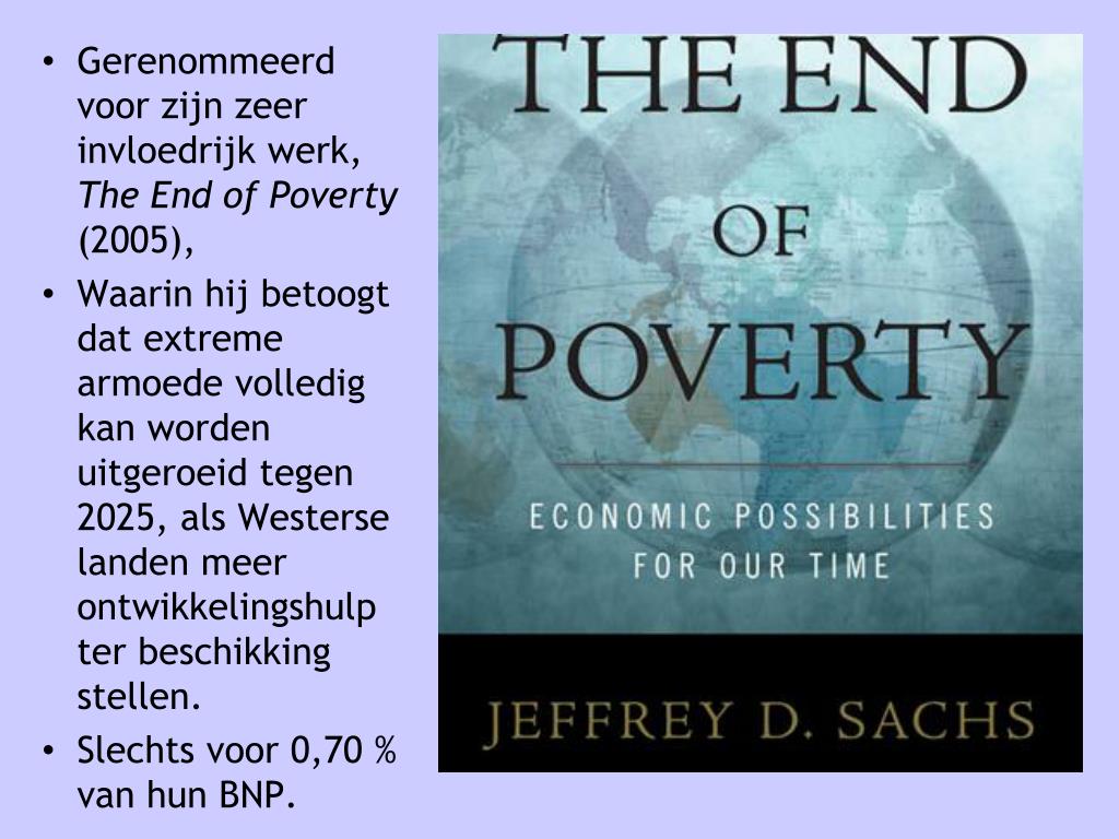 Gerenommeerdvoorzijnzeerinvloedrijkwerk, The End of Poverty (2005), Waarinhijbetoogtdat extreme armoedevolledigkanwordenuitgeroeidtegen2025, alsWesterselandenmeerontwikkelingshulpterbeschikkingstellen. Slechtsvoor 0,70 % van hun BNP.