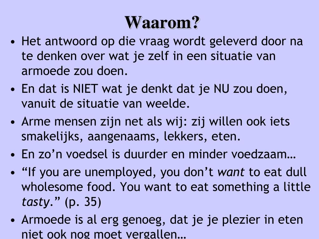 Waarom? • Het antwoord op die vraag wordt geleverd door na te denken over wat je zelf in een situatie van armoede zou doen. • En dat is NIET wat je denkt dat je NU zou doen, vanuit de situatie van weelde. • Arme mensen zijn net als wij: zij willen ook iets smakelijks, aangenaams, lekkers, eten. • En zo’n voedsel is duurder en minder voedzaam… • “If you are unemployed, you don’t want to eat dull wholesome food. You want to eat something a little tasty.” (p. 35) • Armoede is al erg genoeg, dat je je plezier in eten niet ook nog moet vergallen…