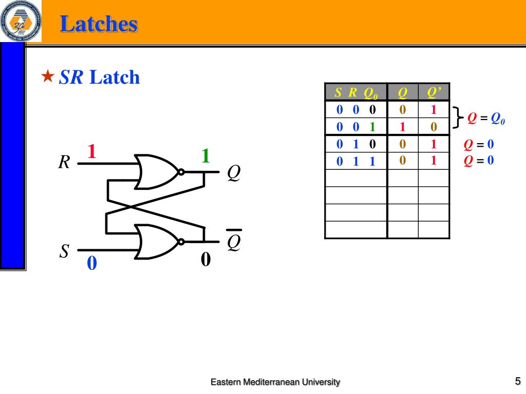 Latches • SR Latch Q = Q0 Q = 0 1 0 1 0 Eastern Mediterranean University