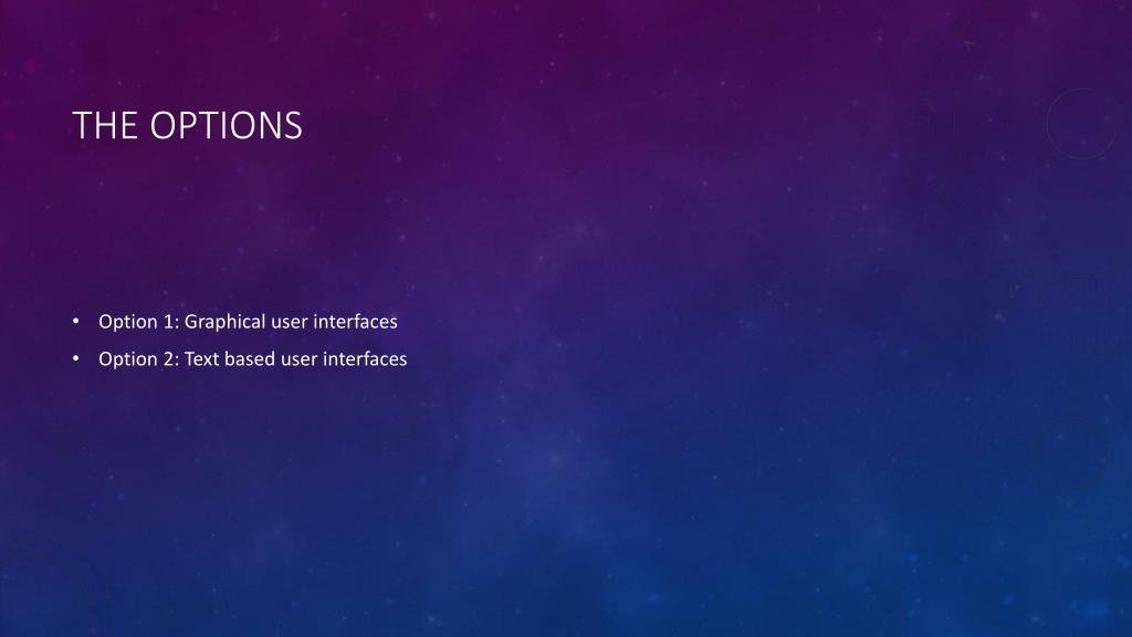 The options • Option 1: Graphical user interfaces • Option 2: Text based user interfaces