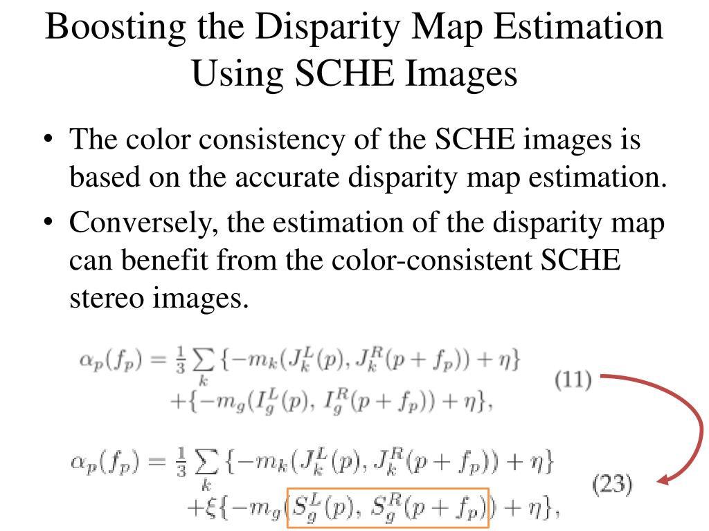 Boosting the Disparity Map Estimation Using SCHE Images • The color consistency of the SCHE images is based on the accurate disparity map estimation. • Conversely, the estimation of the disparity map can benefit from the color-consistent SCHE stereo images.