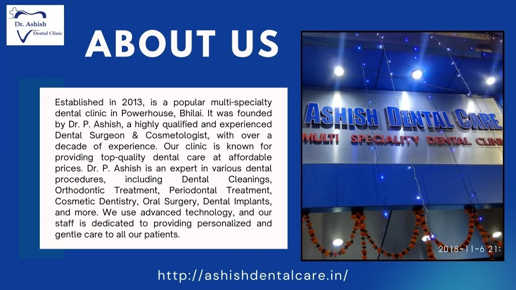 ABOUT US Established in 2013, is a popular multi-specialty dental clinic in Powerhouse, Bhilai. It was founded by Dr. P. Ashish, a highly qualified and experienced Dental Surgeon & Cosmetologist, with over a decade of experience. Our clinic is known for providing top-quality dental care at affordable prices. Dr. P. Ashish is an expert in various dental procedures, including Orthodontic Treatment, Periodontal Treatment, Cosmetic Dentistry, Oral Surgery, Dental Implants, and more. We use advanced technology, and our staff is dedicated to providing personalized and gentle care to all our patients. Dental Cleanings, http://ashishdentalcare.in/