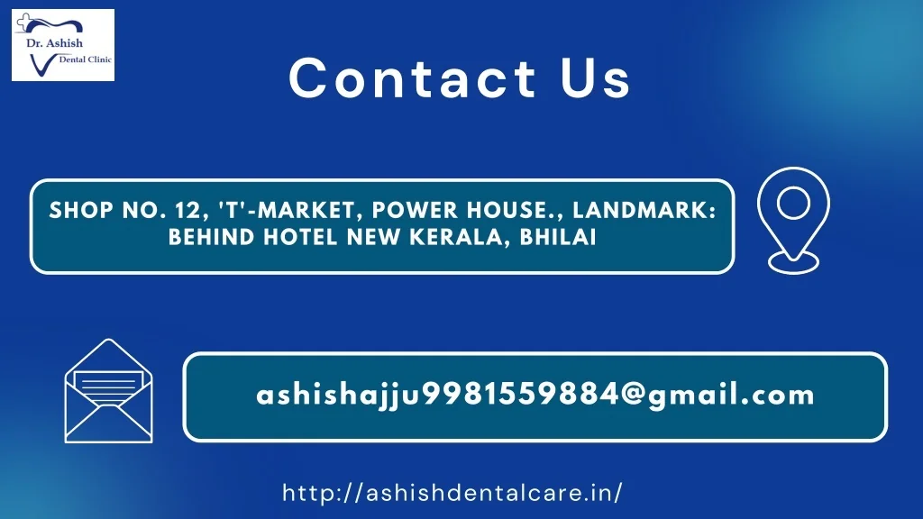 Contact Us SHOP NO. 12, 'T'-MARKET, POWER HOUSE., LANDMARK: BEHIND HOTEL NEW KERALA, BHILAI ashishajju9981559884@gmail.com http://ashishdentalcare.in/