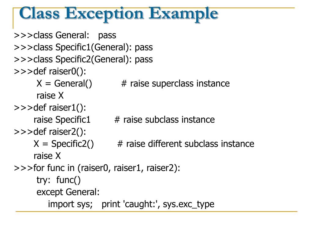 Class Exception Example >>>class General: pass >>>class Specific1(General): pass >>>class Specific2(General): pass >>>def raiser0(): X = General() # raise superclass instance raise X >>>def raiser1(): raise Specific1 # raise subclass instance >>>def raiser2(): X = Specific2() # raise different subclass instance raise X >>>for func in (raiser0, raiser1, raiser2): try: func() except General: import sys; print 'caught:', sys.exc_type