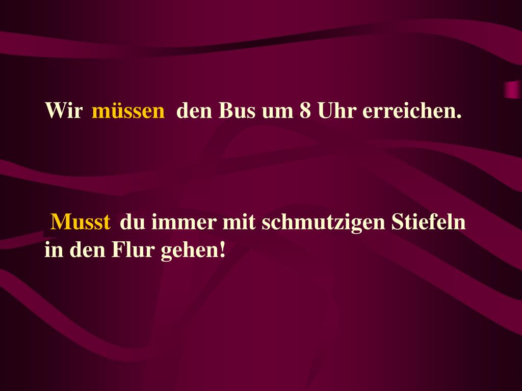 Wir _______ den Bus um 8 Uhr erreichen. müssen ______ du immer mit schmutzigen Stiefeln in den Flur gehen! Musst