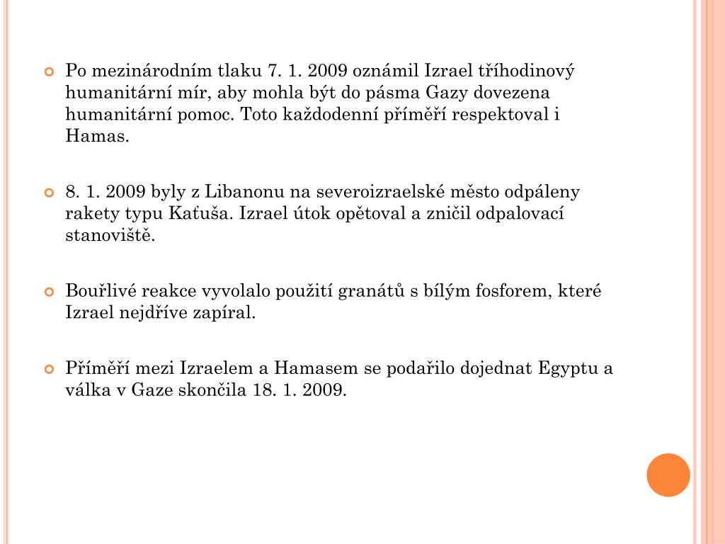 Po mezinárodním tlaku 7. 1. 2009 oznámil Izrael tříhodinový humanitární mír, aby mohla být do pásma Gazy dovezena humanitární pomoc. Toto každodenní příměří respektoval i Hamas. • 8. 1. 2009 byly z Libanonu na severoizraelské město odpáleny rakety typu Kaťuša. Izrael útok opětoval a zničil odpalovací stanoviště. • Bouřlivé reakce vyvolalo použití granátů s bílým fosforem, které Izrael nejdříve zapíral. • Příměří mezi Izraelem a Hamasem se podařilo dojednat Egyptu a válka v Gaze skončila 18. 1. 2009.