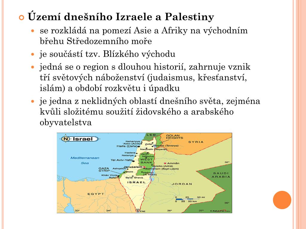 Území dnešního Izraele a Palestiny • se rozkládá na pomezí Asie a Afriky na východním břehu Středozemního moře • je součástí tzv. Blízkého východu • jedná se o region s dlouhou historií, zahrnuje vznik tří světových náboženství (judaismus, křesťanství, islám) a období rozkvětu i úpadku • je jedna z neklidných oblastí dnešního světa, zejména kvůli složitému soužití židovského a arabského obyvatelstva