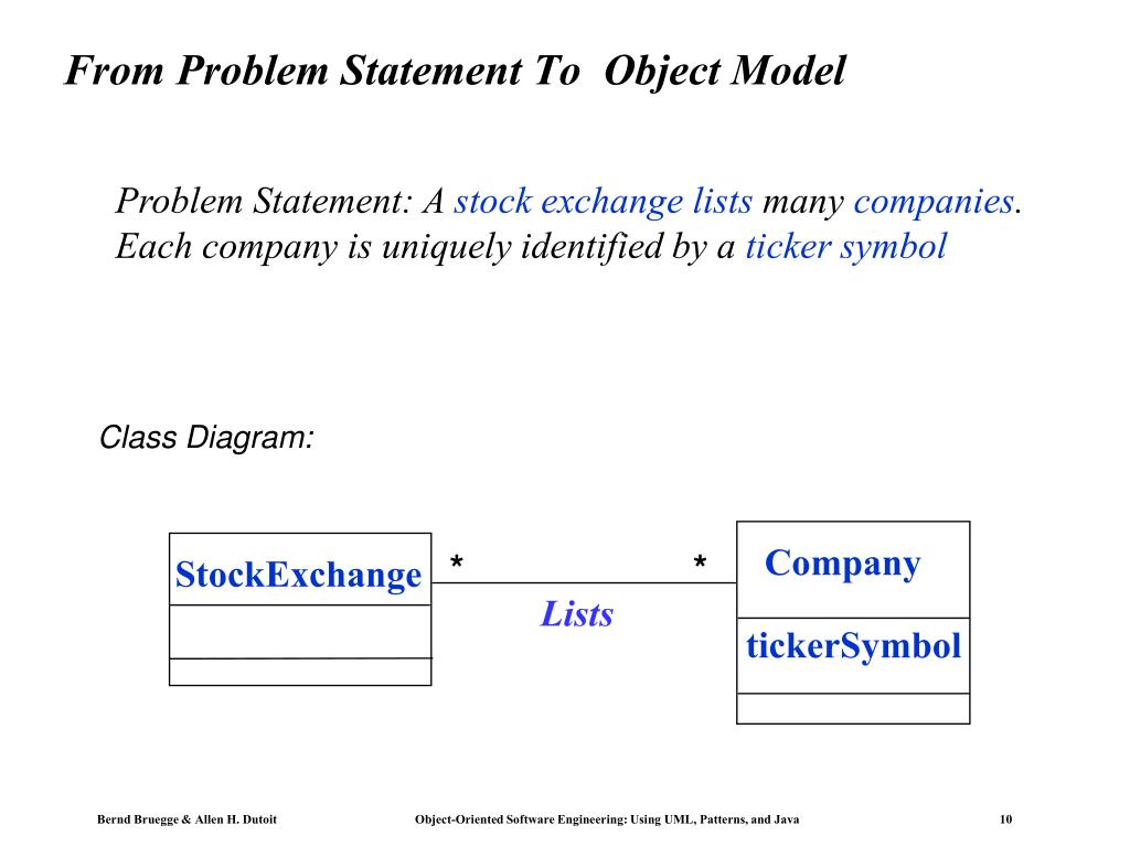 Class Diagram: Company * * StockExchange Lists tickerSymbol From Problem Statement To Object Model Problem Statement: A stock exchange lists many companies. Each company is uniquely identified by a ticker symbol