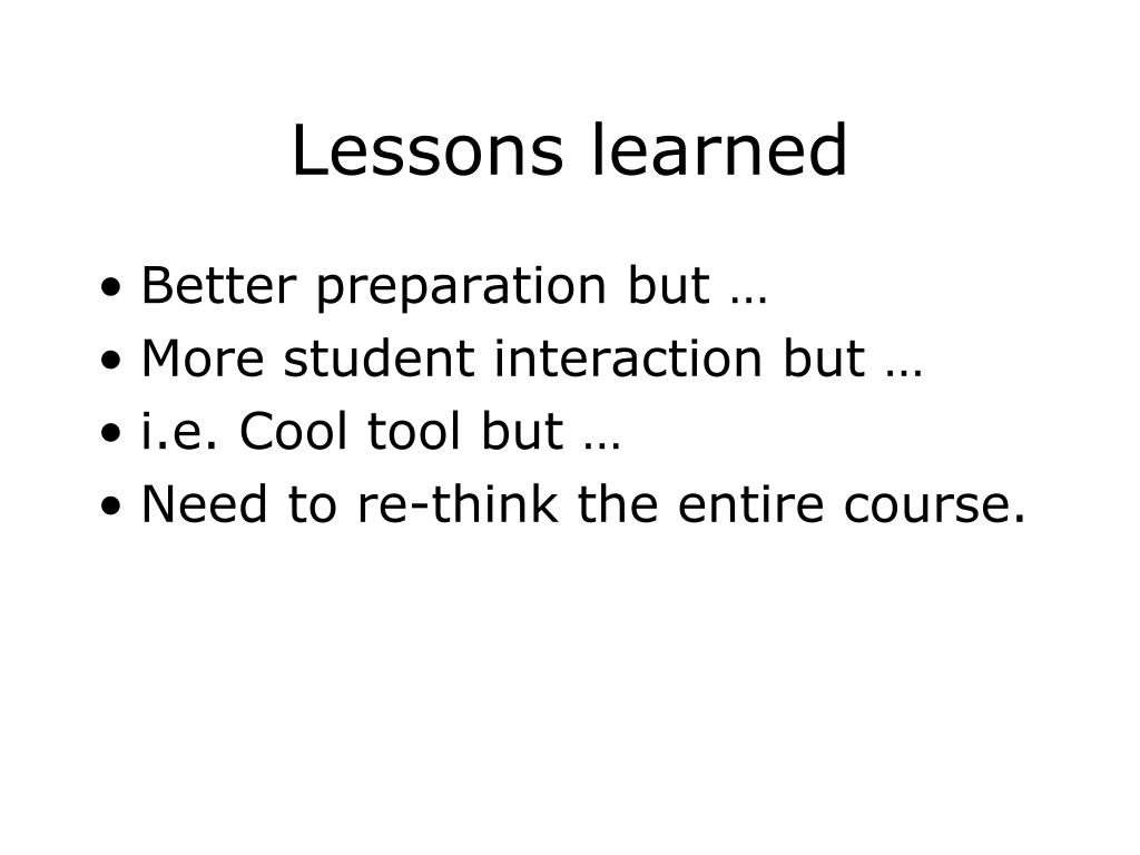 Lessons learned • Better preparation but … • More student interaction but … • i.e. Cool tool but … • Need to re-think the entire course.