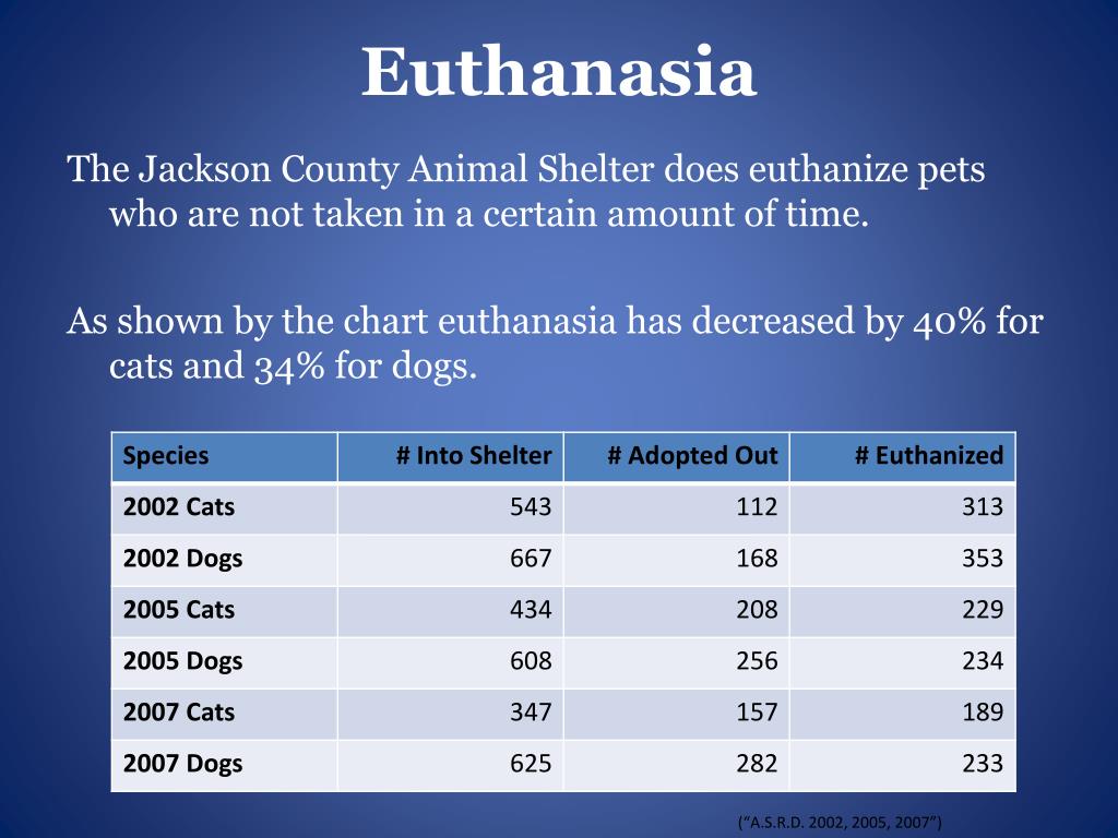 Euthanasia The Jackson County Animal Shelter does euthanize pets who are not taken in a certain amount of time. As shown by the chart euthanasia has decreased by 40% for cats and 34% for dogs. (“A.S.R.D. 2002, 2005, 2007”)