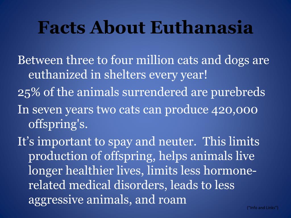 Facts About Euthanasia Between three to four million cats and dogs are euthanized in shelters every year! 25% of the animals surrendered are purebreds In seven years two cats can produce 420,000 offspring's. It’s important to spay and neuter. This limits production of offspring, helps animals live longer healthier lives, limits less hormone-related medical disorders, leads to less aggressive animals, and roam (“Info and Links”)