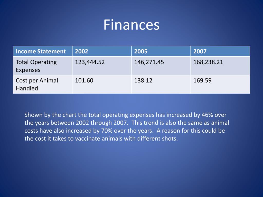 Finances Shown by the chart the total operating expenses has increased by 46% over the years between 2002 through 2007. This trend is also the same as animal costs have also increased by 70% over the years. A reason for this could be the cost it takes to vaccinate animals with different shots.