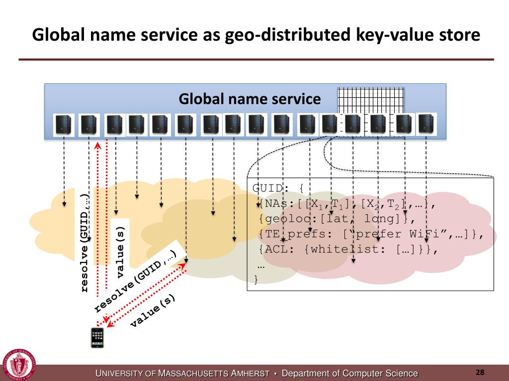 Global name service as geo-distributed key-value store Global name service GUID: { {NAs:[[X1,T1],[X2,T2],…}, {geoloc:[lat, long]}, {TE_prefs: [“prefer WiFi”,…]}, {ACL: {whitelist: […]}}, … } resolve(GUID,…) value(s) resolve(GUID,…) value(s)