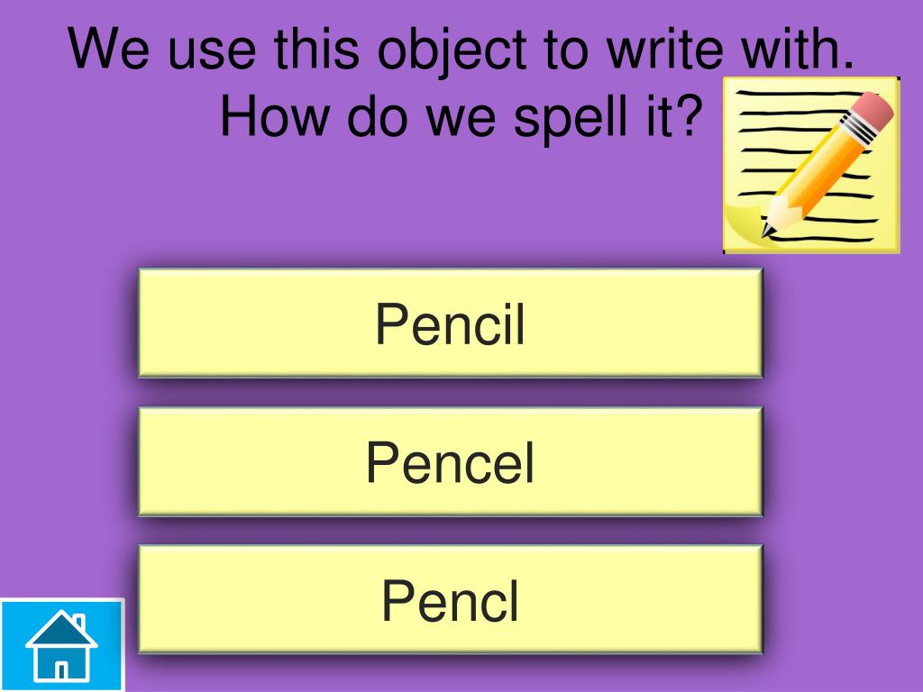 We use this object to write with. How do we spell it? Pencil Pencel Pencl