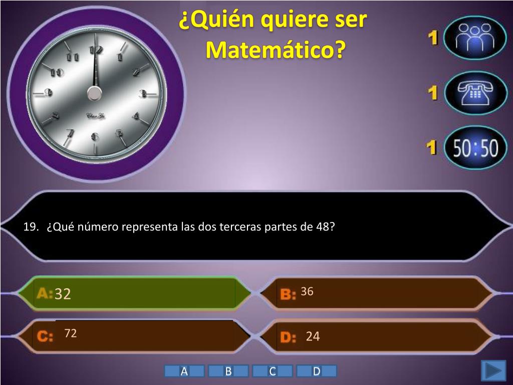 ¿Quién quiere ser Matemático? • 19. ¿Qué número representa las dos terceras partes de 48? 32 • 36 72 • 24 A B C D