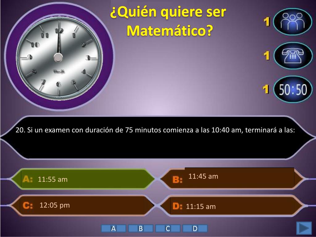 ¿Quién quiere ser Matemático? • 20. Si un examen con duración de 75 minutos comienza a las 10:40 am, terminará a las: 11:45 am 11:55 am 12:05 pm • 11:15 am A B C D