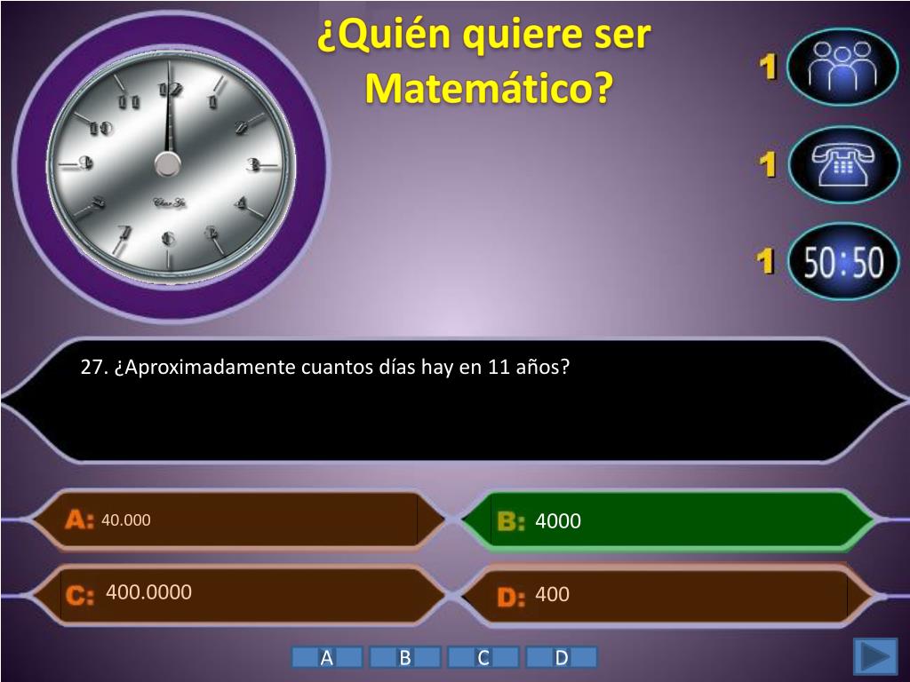 ¿Quién quiere ser Matemático? • 27. ¿Aproximadamente cuantos días hay en 11 años? 4000 40.000 400 400.0000 A B C D