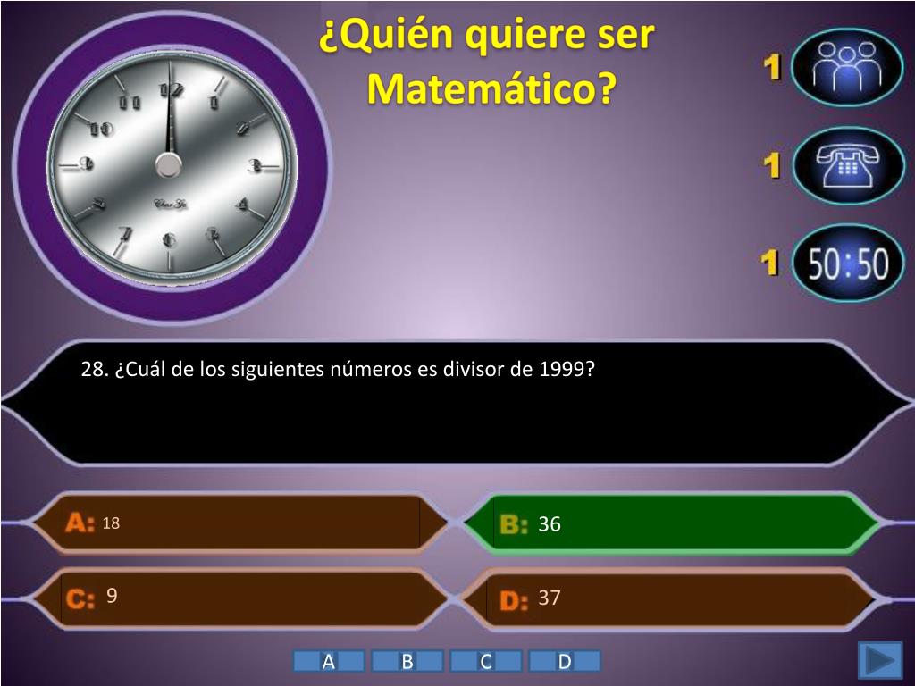 ¿Quién quiere ser Matemático? • 28. ¿Cuál de los siguientes números es divisor de 1999? 36 18 37 9 A B C D