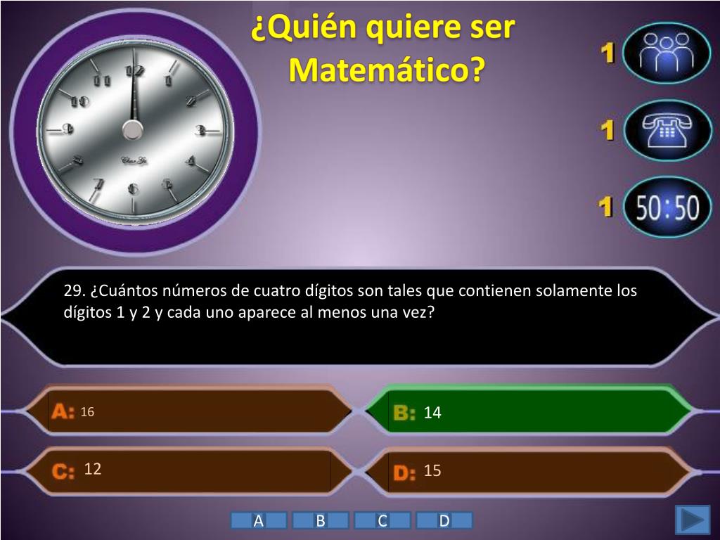 ¿Quién quiere ser Matemático? • 29. ¿Cuántos números de cuatro dígitos son tales que contienen solamente los dígitos 1 y 2 y cada uno aparece al menos una vez? 14 16 15 12 A B C D