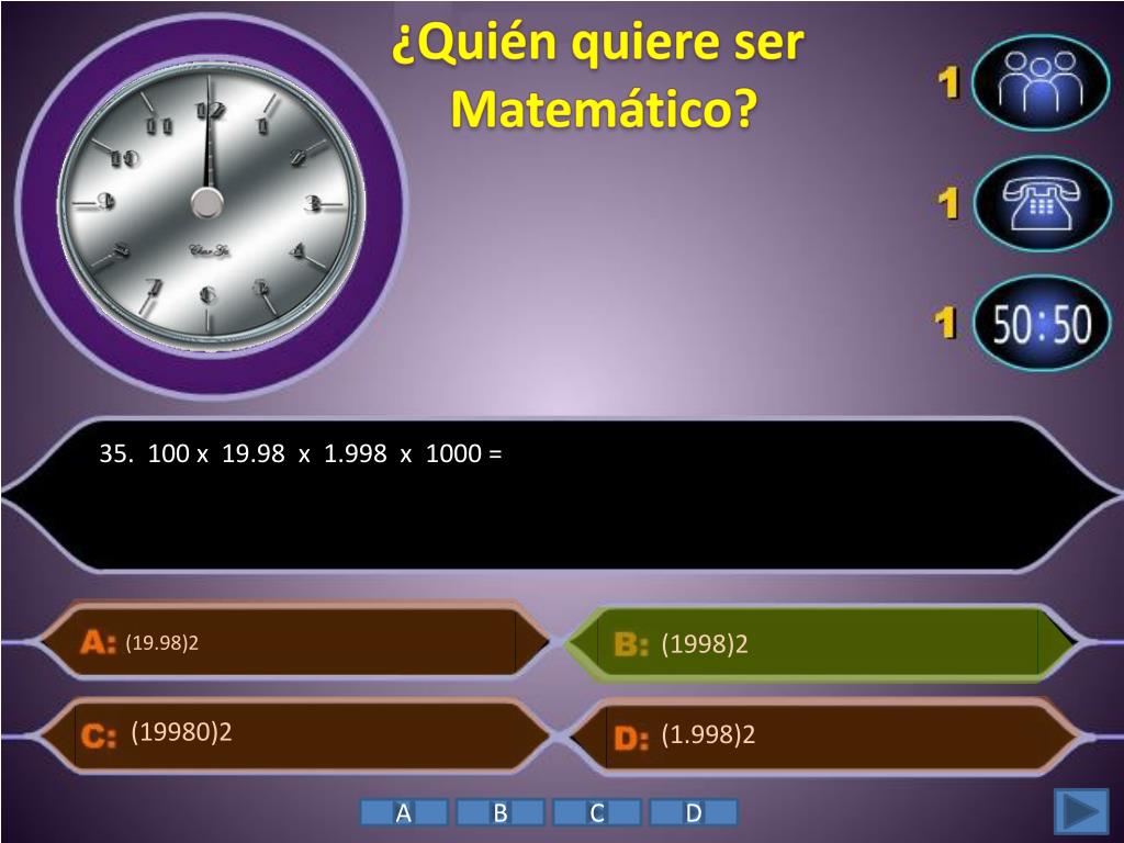 ¿Quién quiere ser Matemático? • 35. 100 x 19.98 x 1.998 x 1000 = (1998)2 (19.98)2 (1.998)2 (19980)2 A B C D