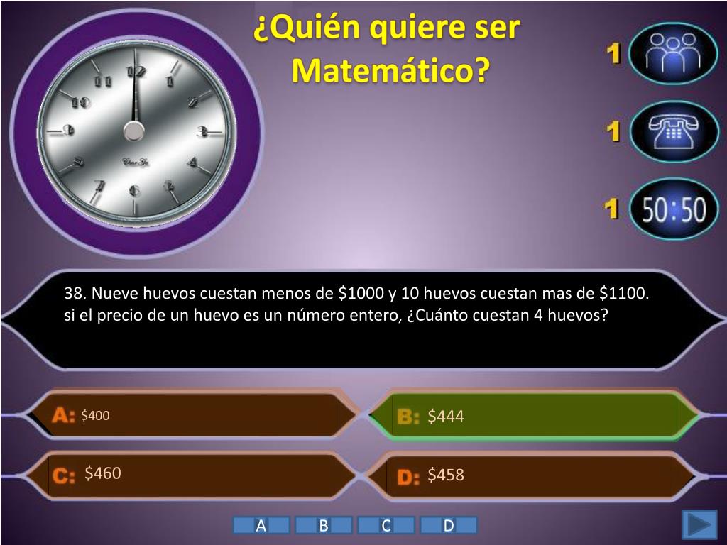 ¿Quién quiere ser Matemático? • 38. Nueve huevos cuestan menos de $1000 y 10 huevos cuestan mas de $1100. si el precio de un huevo es un número entero, ¿Cuánto cuestan 4 huevos? $444 $400 $458 $460 A B C D