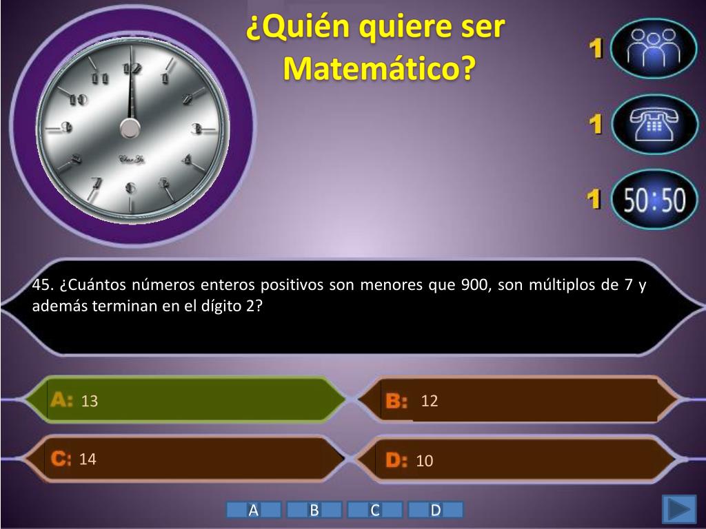 ¿Quién quiere ser Matemático? • 45. ¿Cuántos números enteros positivos son menores que 900, son múltiplos de 7 y además terminan en el dígito 2? • 13 12 • 10 14 A B C D