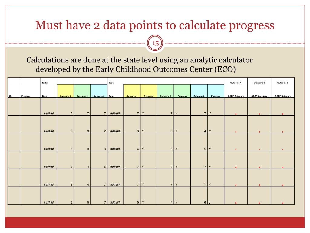 Must have 2 data points to calculate progress Calculations are done at the state level using an analytic calculator developed by the Early Childhood Outcomes Center (ECO)