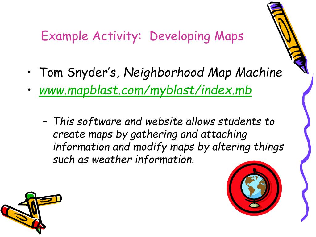 Example Activity: Developing Maps • Tom Snyder’s, Neighborhood Map Machine • www.mapblast.com/myblast/index.mb • This software and website allows students to create maps by gathering and attaching information and modify maps by altering things such as weather information.