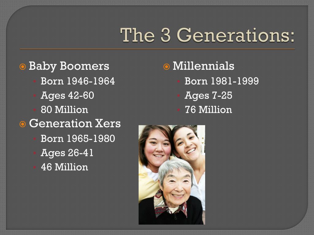The 3 Generations: • Baby Boomers • Born 1946-1964 • Ages 42-60 • 80 Million • Generation Xers • Born 1965-1980 • Ages 26-41 • 46 Million • Millennials • Born 1981-1999 • Ages 7-25 • 76 Million