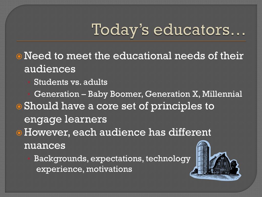 Today’s educators… • Need to meet the educational needs of their audiences • Students vs. adults • Generation – Baby Boomer, Generation X, Millennial • Should have a core set of principles to engage learners • However, each audience has different nuances • Backgrounds, expectations, technology experience, motivations