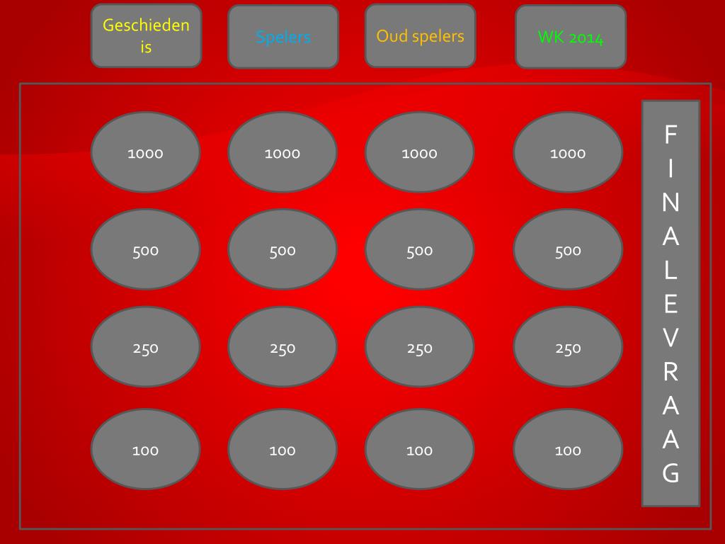 Geschiedenis Oud spelers Spelers WK 2014 F I N A L E V R A A G 1000 1000 1000 1000 500 500 500 500 250 250 250 250 100 100 100 100