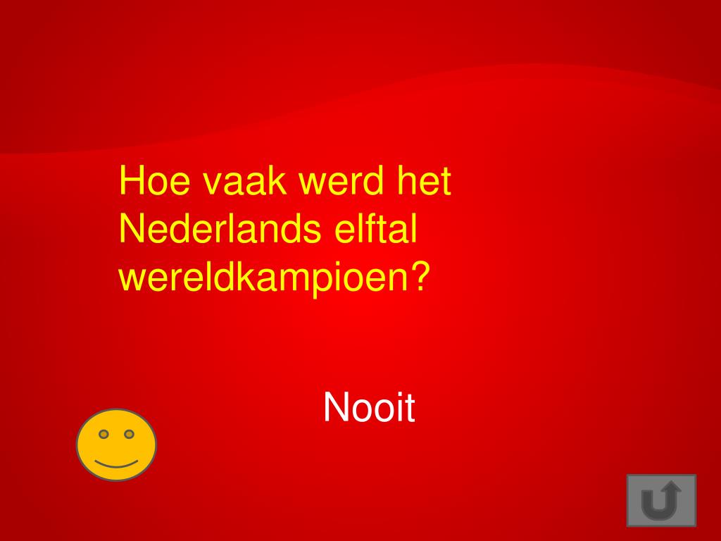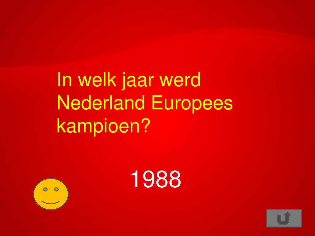 Deze quiz heeft 4 onderwerpen met elk 4 vragen. Er zijn dus in totaal 16 vragen. Je moet de vragen per thema op volgorde beantwoorden. Je begint dus bij de vraag van 100 punten. Je mag wel wisselen van thema. Klik op de ovaal van je keuze om naar de vraag te gaan. Klik op de terugknop om naar het hoofdmenu te gaan. De finalevraag wordt door alle teams beantwoord. Het team dat het dichtst bij het goede antwoord komt wint 2500 pt. Klik op het lachebekje voor het goede antwoord. Wij houden van Oranje