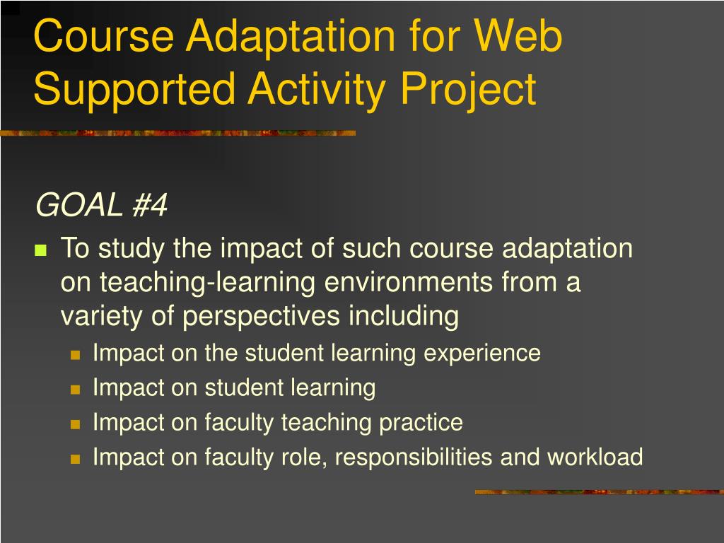 Course Adaptation for Web Supported Activity Project GOAL #4 • To study the impact of such course adaptation on teaching-learning environments from a variety of perspectives including • Impact on the student learning experience • Impact on student learning • Impact on faculty teaching practice • Impact on faculty role, responsibilities and workload